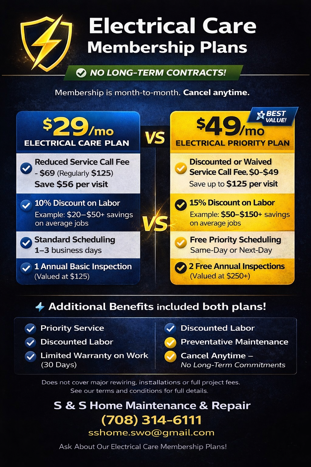 We help homeowners avoid expensive electrical repair bills with priority service, discounted rates, and preventative maintenance.